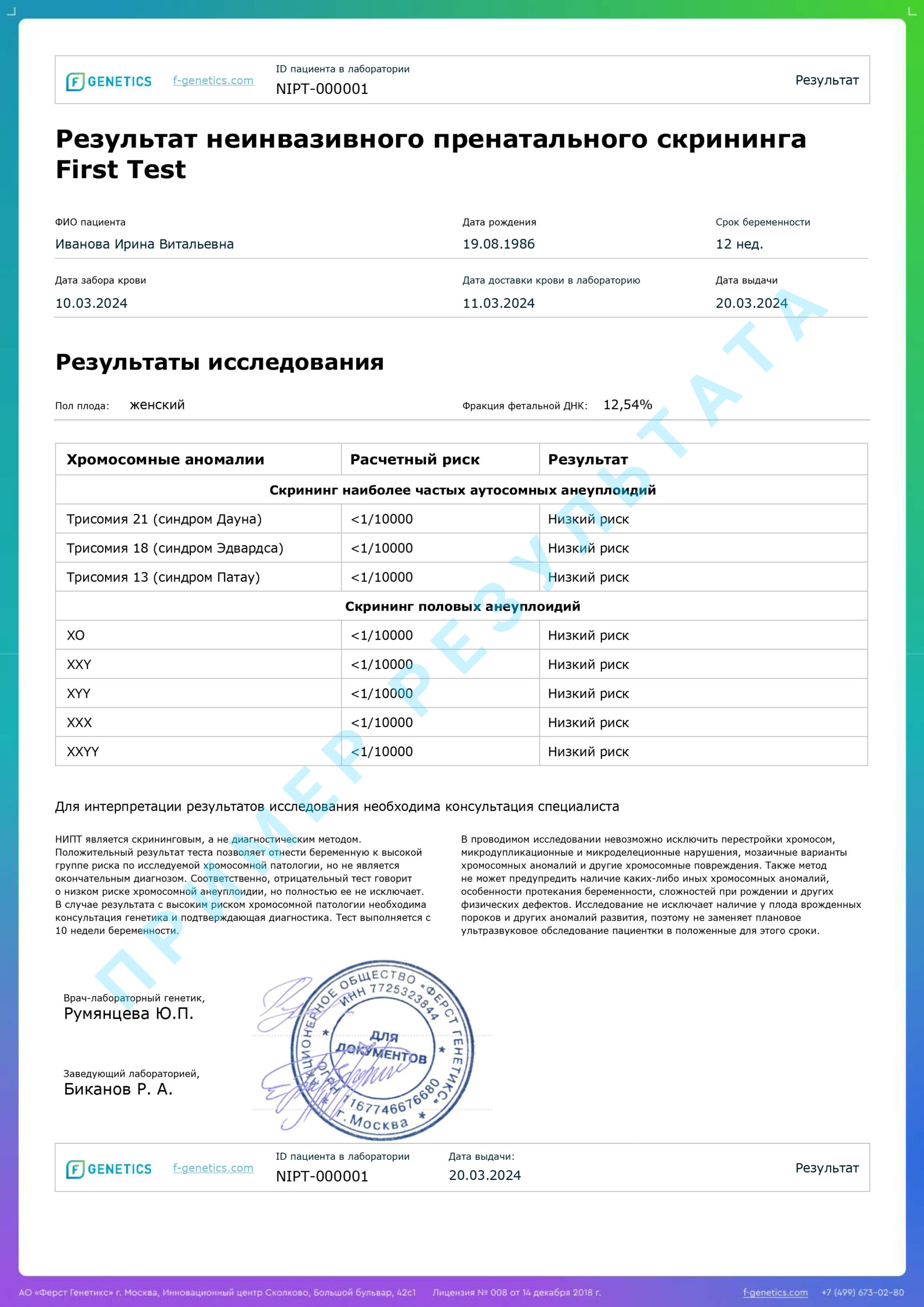 Fetal DNA is extracted from the venous blood of the mother, which is found in the blood of a pregnant woman and can make up to 10% of the total DNA volume. The resulting DNA is analyzed by next generation sequencing, the chromosomal ratio of cfDNA is calculated, and after processing with special algorithms, the most accurate result is generated regarding the presence of common genetic abnormalities in the fetus.